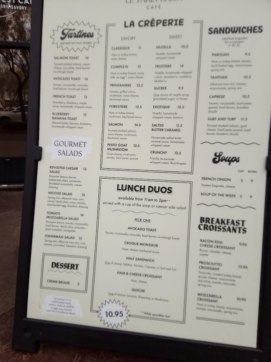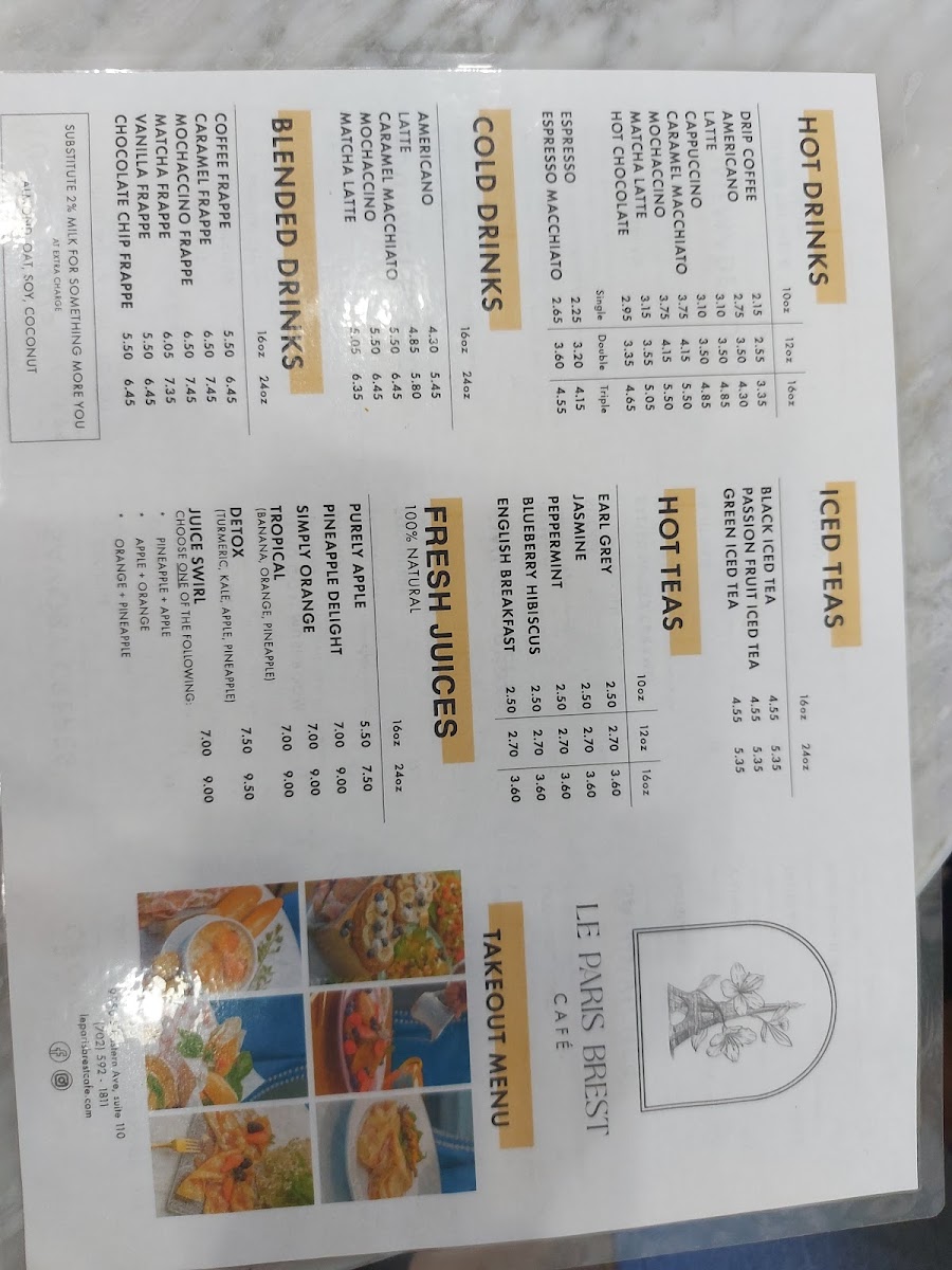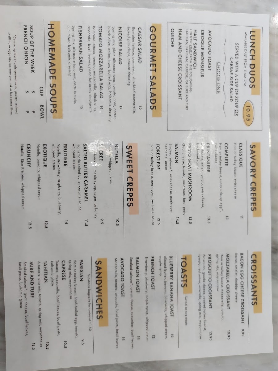 The menu offers a variety of bakery and cafe items, structured into several categories to suit different mealtime needs. Visitors can explore an assortment of pastries including classic French options such as croissants (butter, almond, ham and cheese), meringues, and tarts. Freshly baked breads like the French baguette are also available.