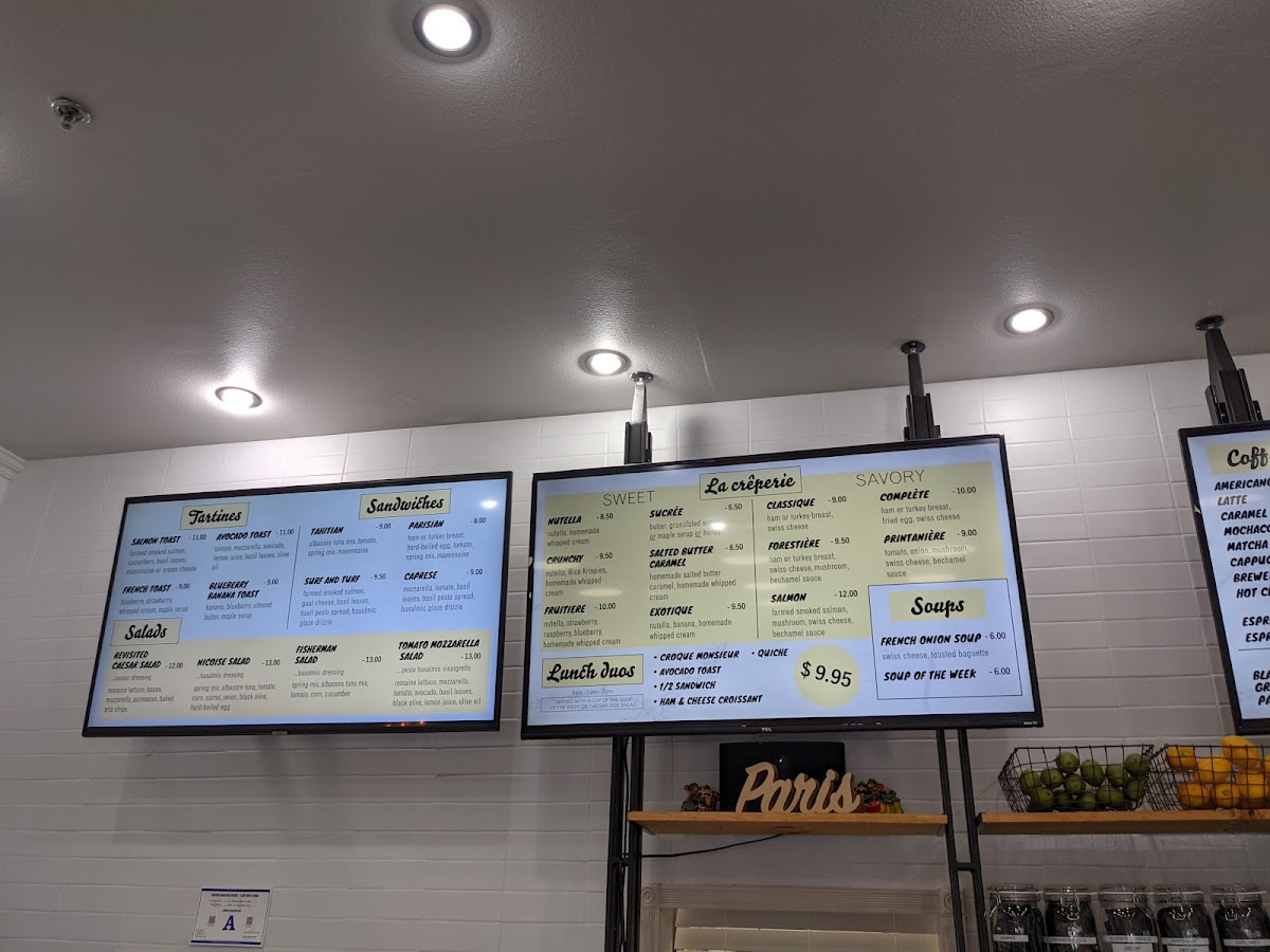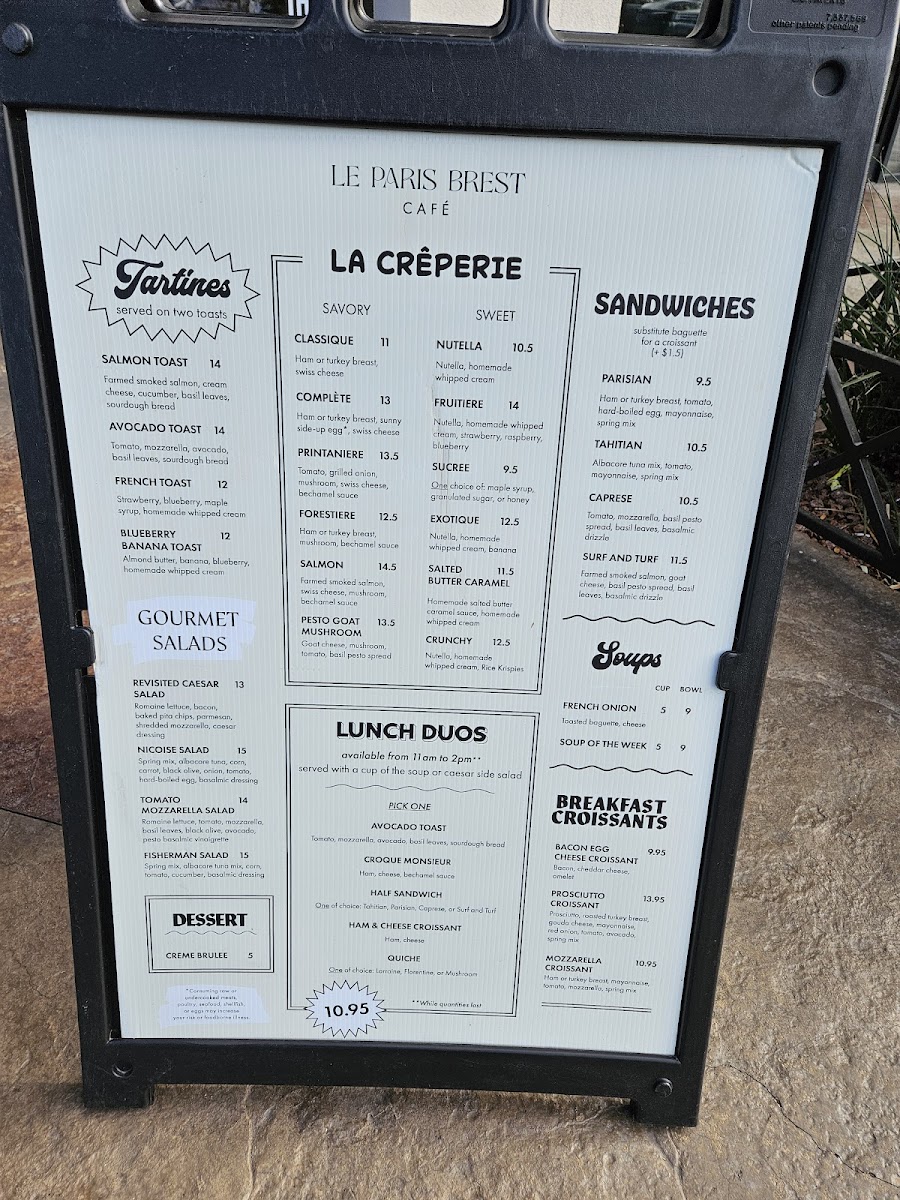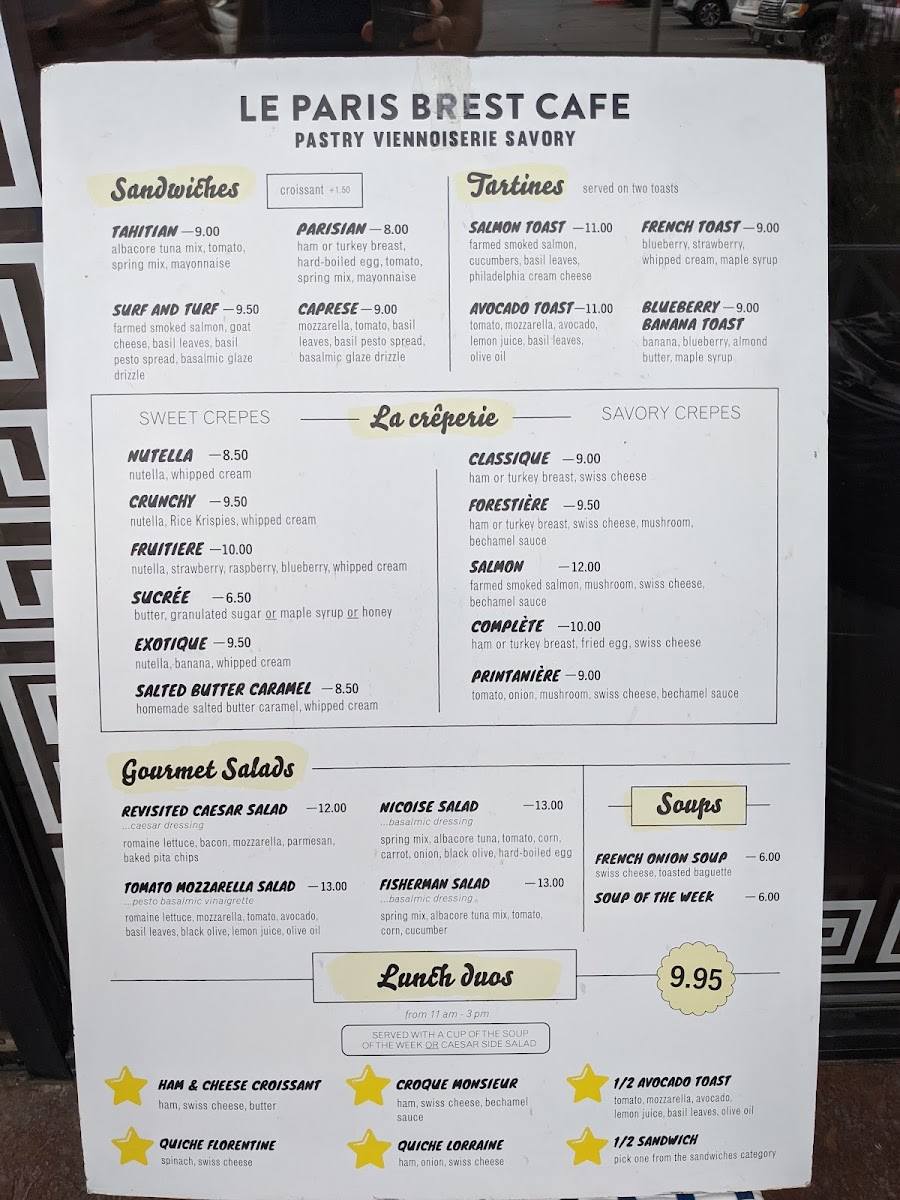 The menu offers a variety of bakery and cafe items, structured into several categories to suit different mealtime needs. Visitors can explore an assortment of pastries including classic French options such as croissants (butter, almond, ham and cheese), meringues, and tarts. Freshly baked breads like the French baguette are also available.